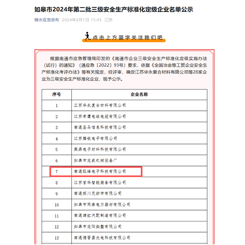 Недавно Управление по чрезвычайным ситуациям города Наньтун опубликовало список предприятий, отнесённых ко второй партии в 2024 году к третьему уровню стандартизации безопасности производства; ООО Нантун Ванфэн Электронных Технологий, расположенно...